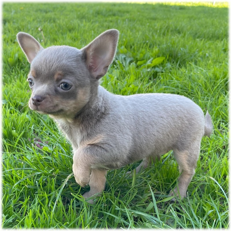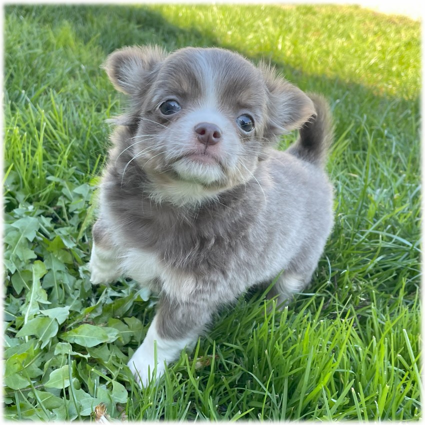 Cette petite femelle Chihuahua de couleur Bleu lavande (Angel) est la plus expressive de la bande toujours en train de couiner pour tout demander. C'est une vrai fille de la campagne qui passe tout son temps dehors.
