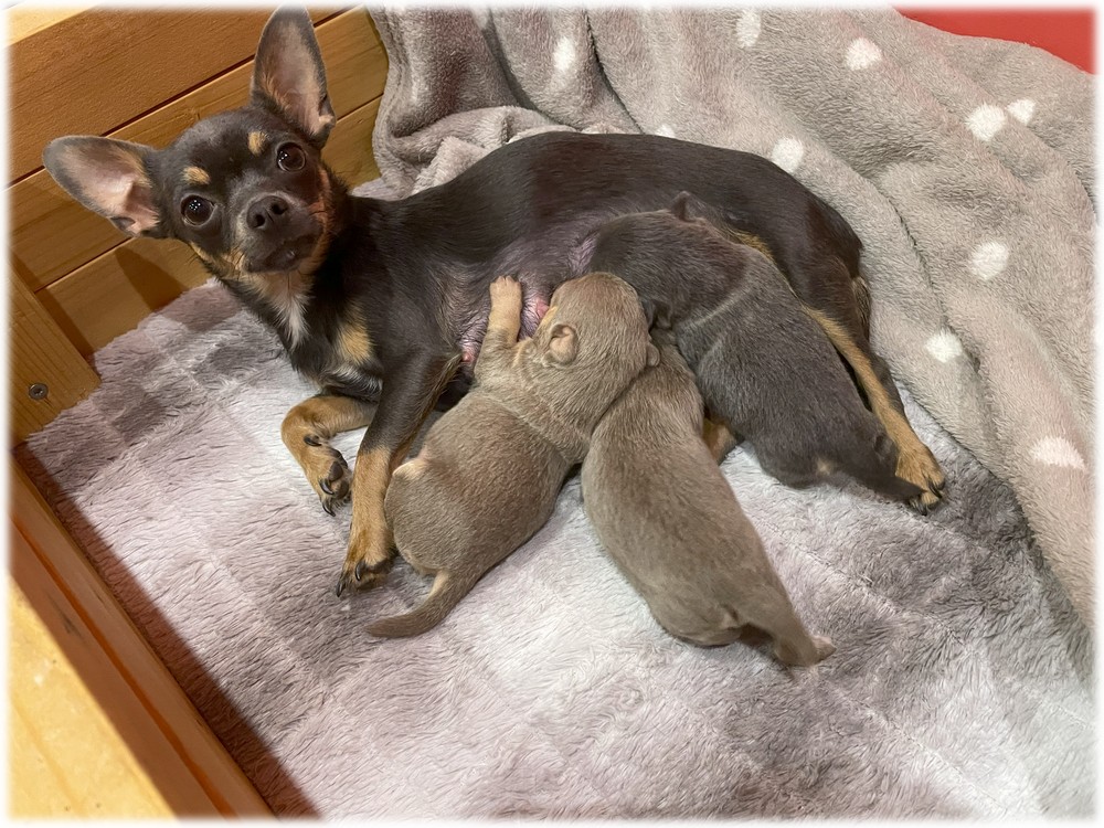 L'élevage du Domaine de Mondon est heureux de vous annoncer la naissance des bébés de Alice, femelle Chihuahua de couleur bleu de notre élevage.
