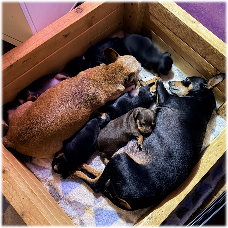 Tina à ainsi donné naissance à 6 jolis bébés Pinscher Nain, dont deux d'entre eux sont de couleur chocolat, couleur non encore admise au standard mais qui arrive parfois comme il est possible de voir la couleur bleue apparaître de temps en temps, dont