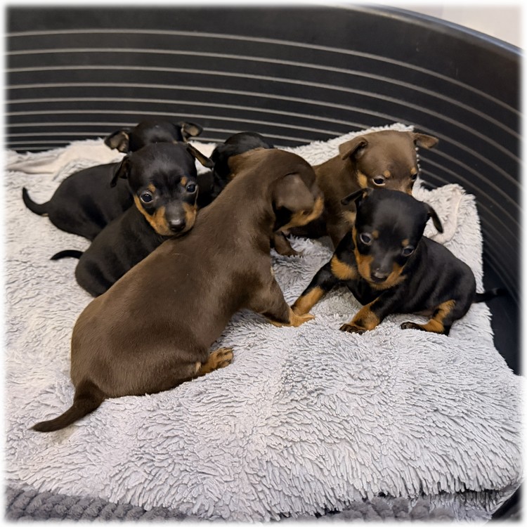 L'élevage du Domaine de Mondon est heureux de vous annoncer la naissance des bébés de Tina, femelle Pinscher Nain de couleur noir et feu de notre élevage.